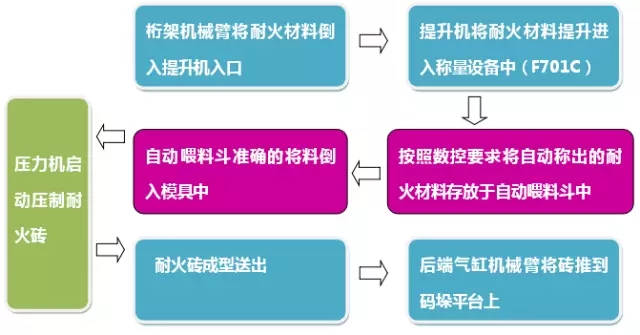 現(xiàn)有人工生產(chǎn)工藝為:粉料上料稱量—粉料倒入壓機模具—壓力機工作—取模—清潔模具—成品檢測,依托同類型鎂碳型耐火磚設(shè)計的全自動化生產(chǎn)線的經(jīng)驗,針對現(xiàn)有工藝進行解決方案的定制。